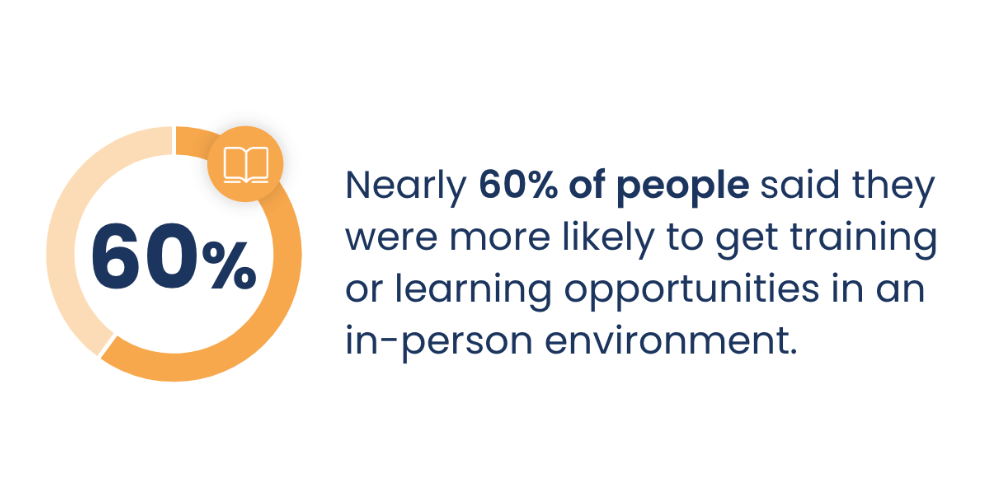 Employees want an even playing field that ensures professional development opportunities are provided to both in office and remote workers. According to our survey, more than half of respondents said they believed they were more likely to be promoted working in-person than remote. Of those, 41% of women thought they were less likely to be promoted if they worked remotely versus 32% of men.