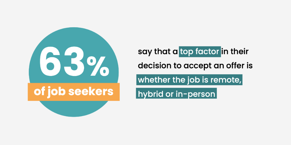 Whether they want to get dressed and go into the office or work from home in their slippers, 93% of our survey respondents said flexibility was top of mind when deciding to apply for or accept a job. According to our survey, 63% of respondents ranked where they worked (remote, hybrid, in-person) as one of the top three factors in their decision whether to accept a job.