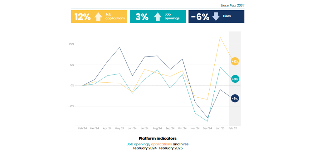 Despite ongoing uncertainty, job seekers are still showing enthusiasm for new opportunities. January and February saw the highest application volumes we’ve seen since the start of 2024, even as hiring dropped by 6%.