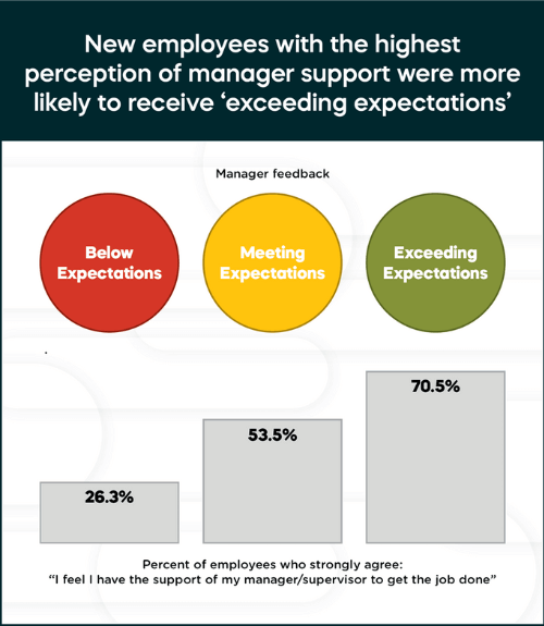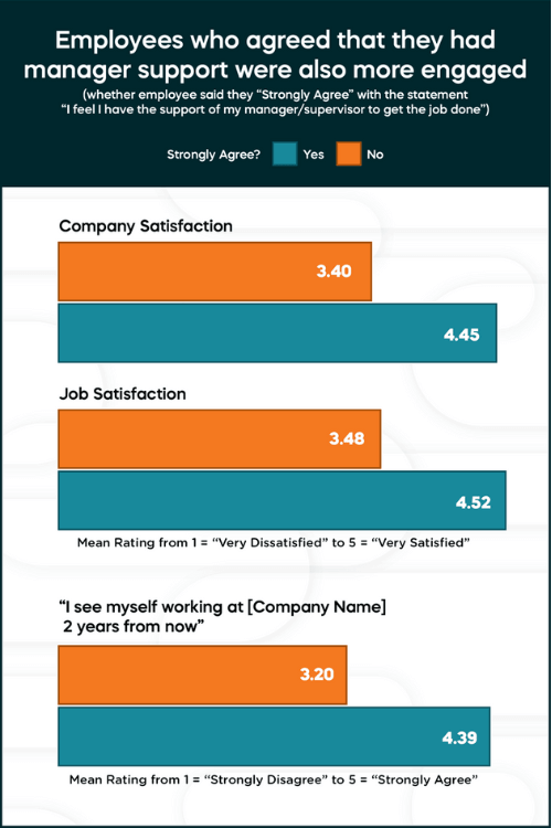 Our data suggests an even finer bullseye: ensure employees feel supported by their managers. This might just lead to greater employee satisfaction at work, longer tenure on the job, and a renewed commitment to going above and beyond.