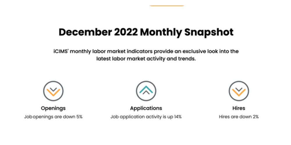 Job openings, job applications and hiring activity continues to trend downward — a pattern that has been in play for the last several months. There is much buzz surrounding the job market, but the declines are likely due to typical year-end seasonality. A slowdown in hiring is not unusual for this time of year, and iCIMS’ data highlights similar patterns in years past.