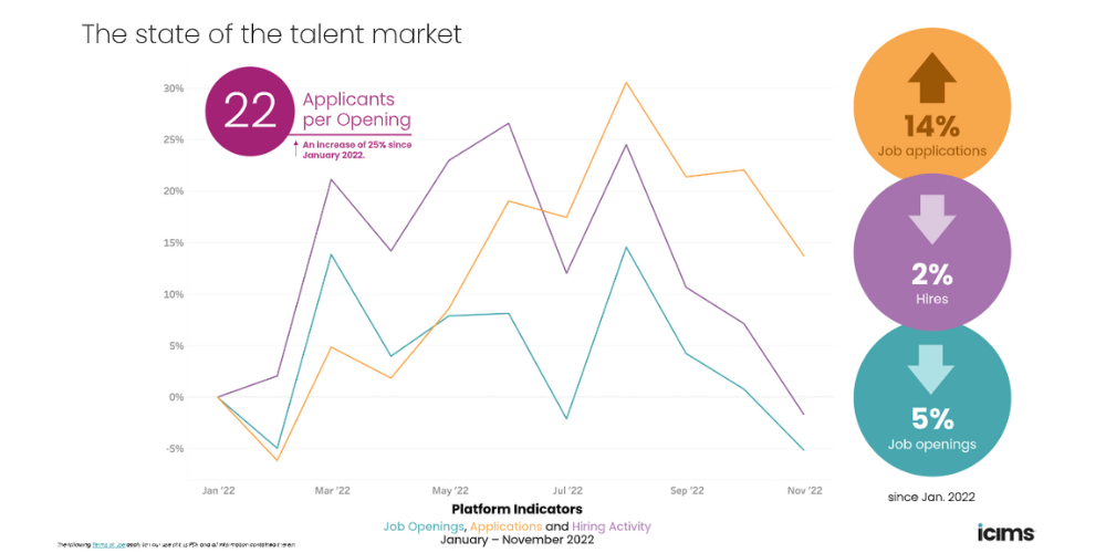 Applications are declining month-over-month as well but remain up 14% since the start of the year. As of November 2022, employers are receiving 22.4 applications per opening – this is an increase of approximately 25% since the beginning of the year and is primarily being driven by the rise in applicants.