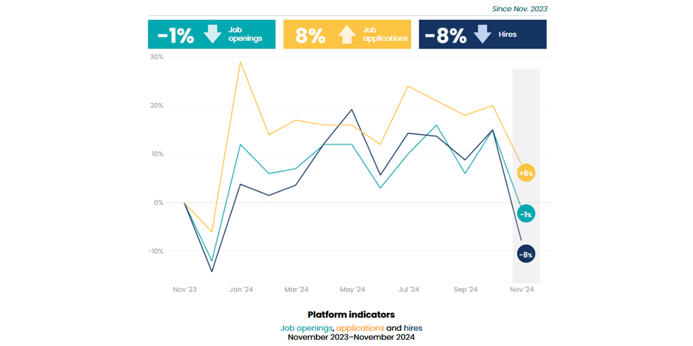 Activity across all three iCIMS platform indicators dropped in November. While this kind of deceleration is normal for the holiday season, the hiring slowdown was more dramatic than usual. Hires decreased by 20% month over month and job openings fell 14%. Applications likewise dropped 10% from October, though they’re still up 8% from November 2023.