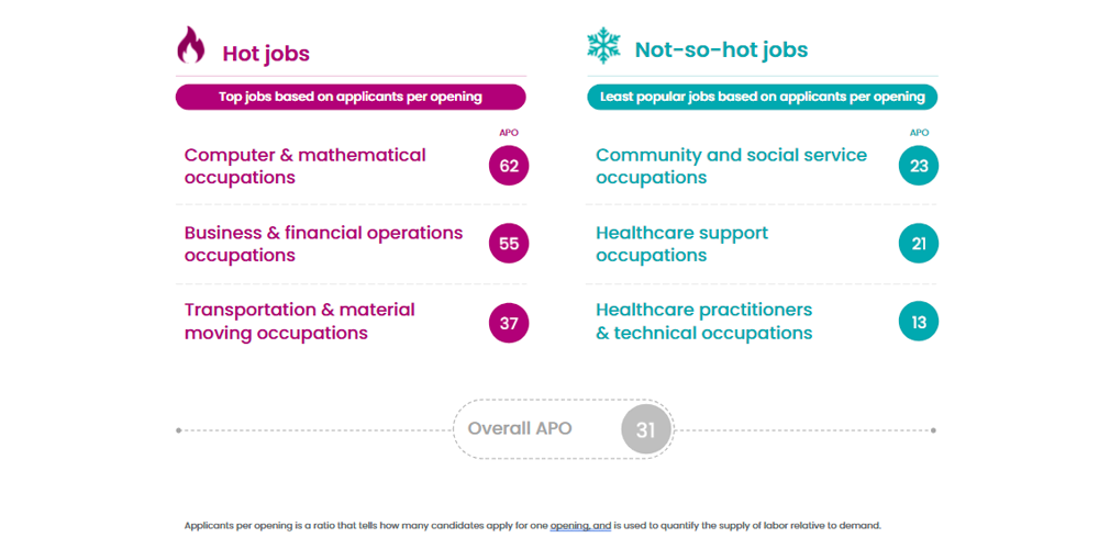 Over in the EMEA region, the job market experienced similar slowdowns. Job activity dipped 8% month over month. Mysteriously, however, application volume remained robust, up 36% compared to this time last year.