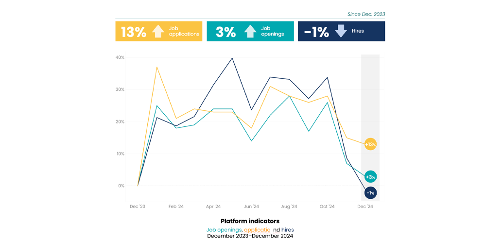 The final months of 2024 saw employers hesitate on hiring. But by December, employers appeared poised to punch up payroll in 2025. iCIMS data showed job openings and hires mostly in line with figures from 2023.