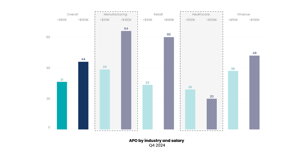 Hiring is hot in manufacturing. Industry roles with salaries greater than $100K had an average of 64 applicants per opening (APO). For comparison, the average APO for jobs in the same salary range, regardless of industry, saw an average APO of 44. For roles in healthcare? APO hovered at a low 20 for six-figure jobs.
