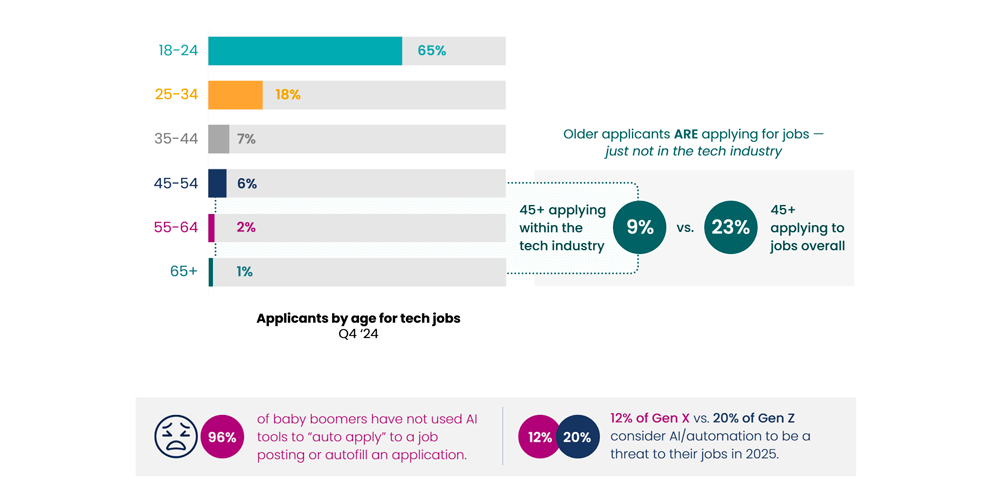 Older workers may be staying in the workforce longer — 23% of applicants were older than 45 at the end of 2024 — but they’re not showing up for tech jobs. In fact, at the end of 2024, only 9% of tech applicants were older than 45, and just 3% were 55 and older.