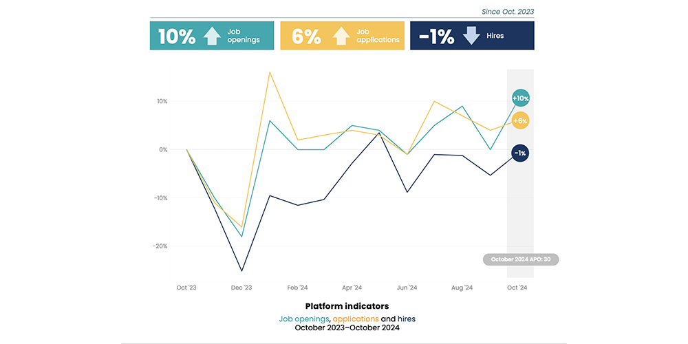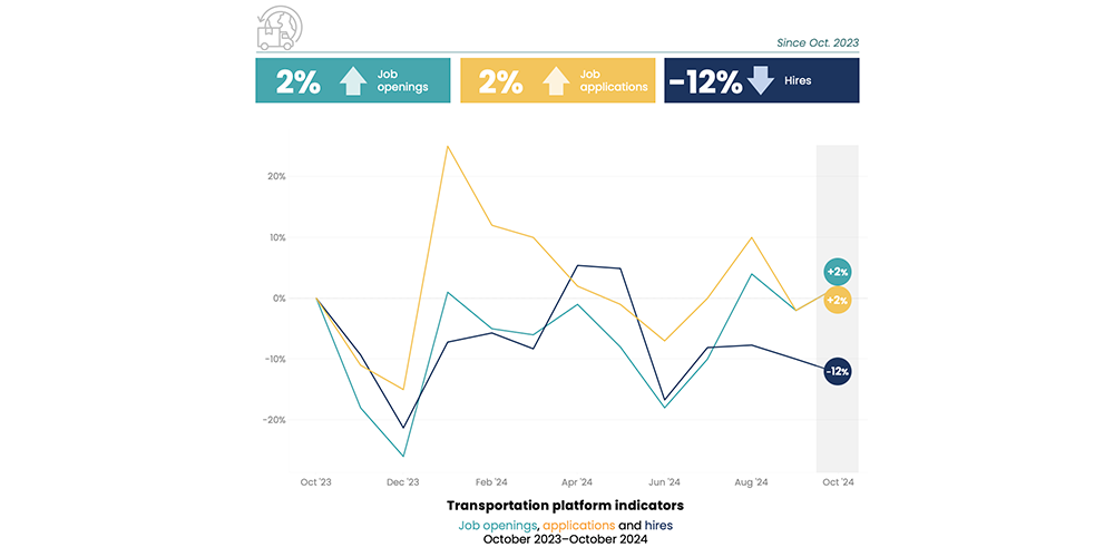 Our October Workforce Report also revealed a surge in job openings for transportation. This news didn’t translate to a slew of transport hires, however. Supply of jobs in transport failed to meet candidate demand in October, as hiring continued to fall — down 2% from September and down 12% from October 2023.