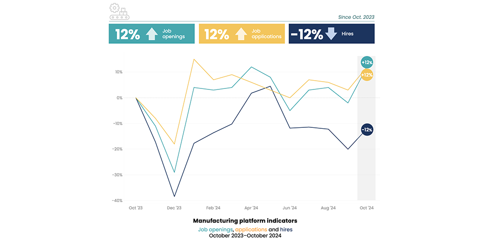 Manufacturers added jobs in only four of the previous 10 months, according to the Labor Department. iCIMS data shows low hiring volume through the second half of 2024. This October’s hiring volume was down 12% from last year’s.