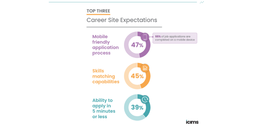 Job seekers want more from the hiring process, expecting personalization and that career sites will have smart functionality to match their skills to open roles. They want it to be fast, with the ability to apply for a job in fewer than five minutes. And they expect to be able to apply from their phone.