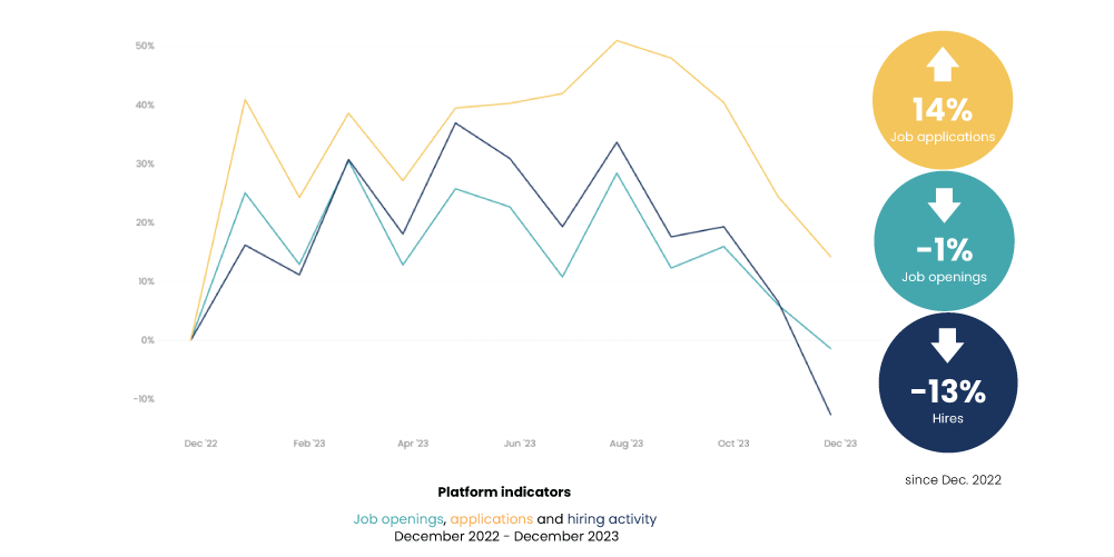 Application volume, for instance, began on a high in January. Levels remained robust throughout 2023, falling only in Q4, when a dip in applicants is nothing but typical. Even so, employers closed the year with 14% more applicants than in 2022.