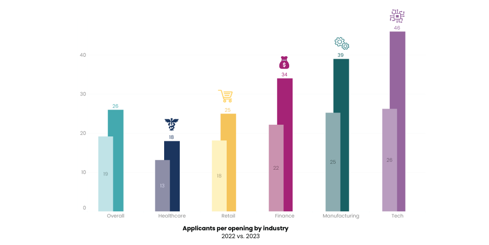 It follows that applicants per opening (APO) enjoyed a strong year, too. APO took off in 2023 — the number of applicants vying for an open position skyrocketed from 19 to 26.