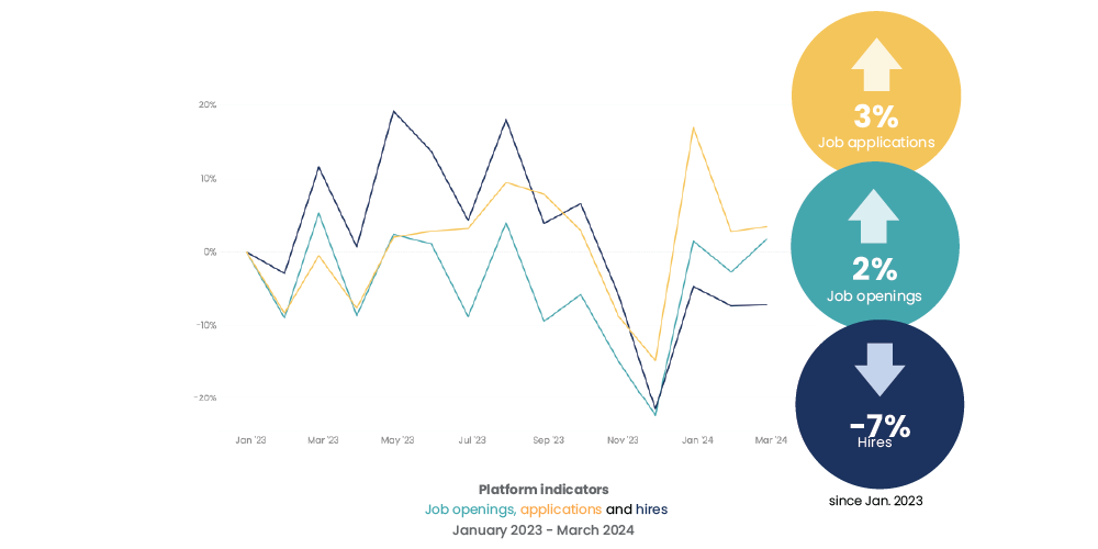 If last year’s market was the stuff of theme parks and carnivals, this year’s is a peaceful river cruise. In March, job applications and job openings quietly climbed from January 2023 levels by 3% and 2%, respectively. There was slightly more drama where hiring was concerned. Hires fell 7%, but even that change appears mild when compared to the sharp plunges hiring saw last year.