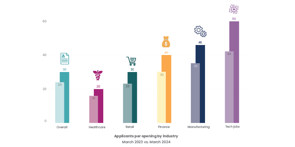 Certain industries are seeing bigger growth in applicants per opening (APO). Tech-related jobs, for instance, have seen a 45% increase in APO since March 2023. Manufacturing jobs also saw a solid 31% growth in APO during the same time period.