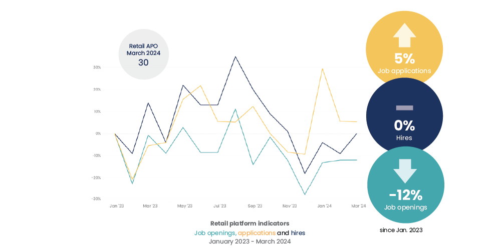 Like many industries, retail endured serious drama in the labor market throughout 2023. The beginning of 2024 offered little respite, as evidenced by a fall in hiring activity in January and February. But hiring inched back to 2023 levels in March, signaling hope and health for the industry.