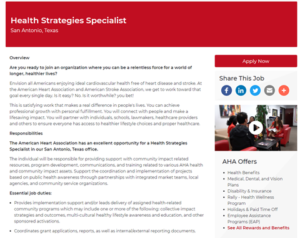 For a best-in-class example of an appealing career site and job postings, look to the American Heart Association. On the main page, employee testimonials tell inspiring stories of purpose and inclusion. Then, their job postings provide a glimpse into the company culture and provide clear job requirements. All of this is written with a personable tone that helps readers feel welcomed and encouraged.