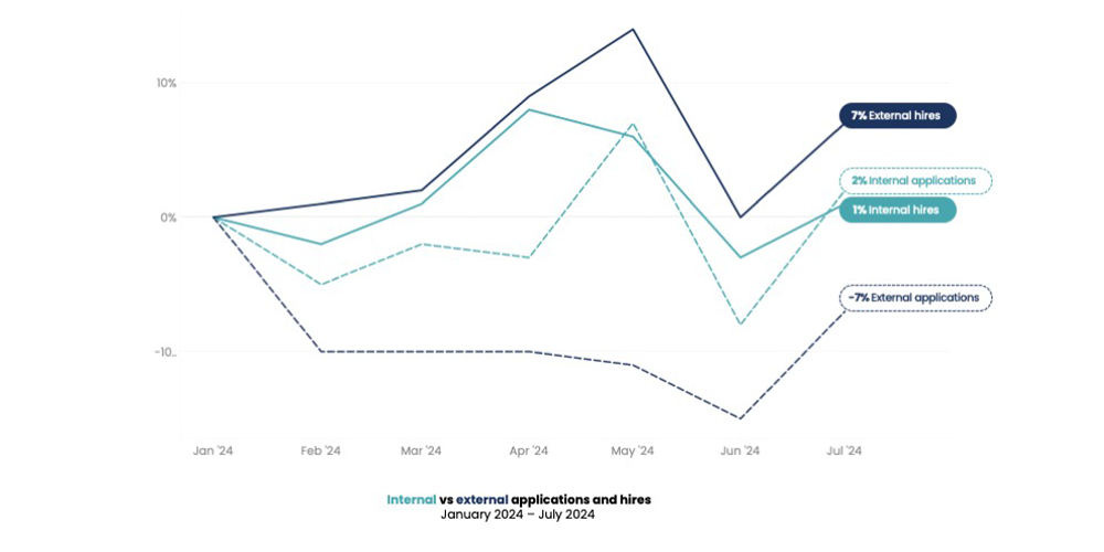 However, employers may not be as keen on internal mobility. iCIMS data shows a 7% increase in external hires versus a 1% increase in internal hires.