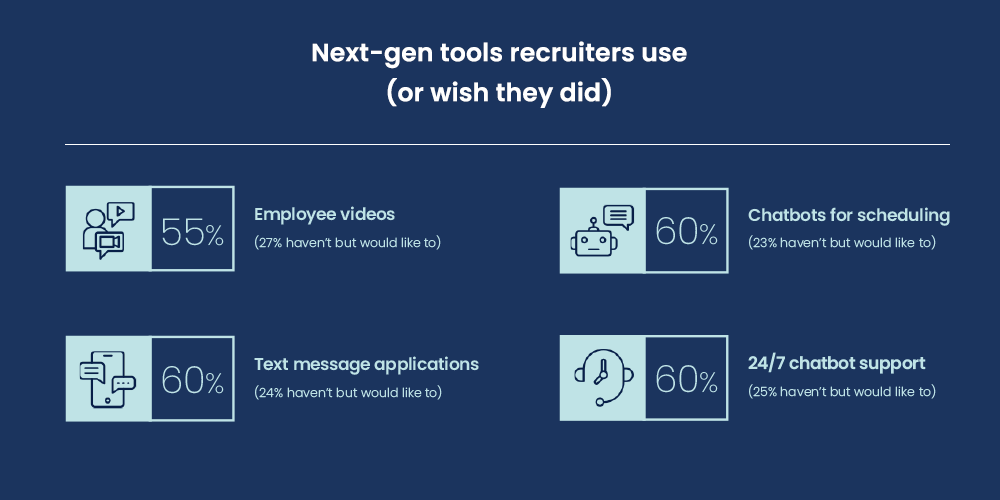 Regardless of how AI is being used, recruiters report success in eliminating tedious, often repetitive, tasks. They’re also using AI in creative ways, including getting help writing job descriptions and developing interview questions. Of those who haven’t fully committed yet, 64% say they’re interested in using AI more throughout the recruiting process.