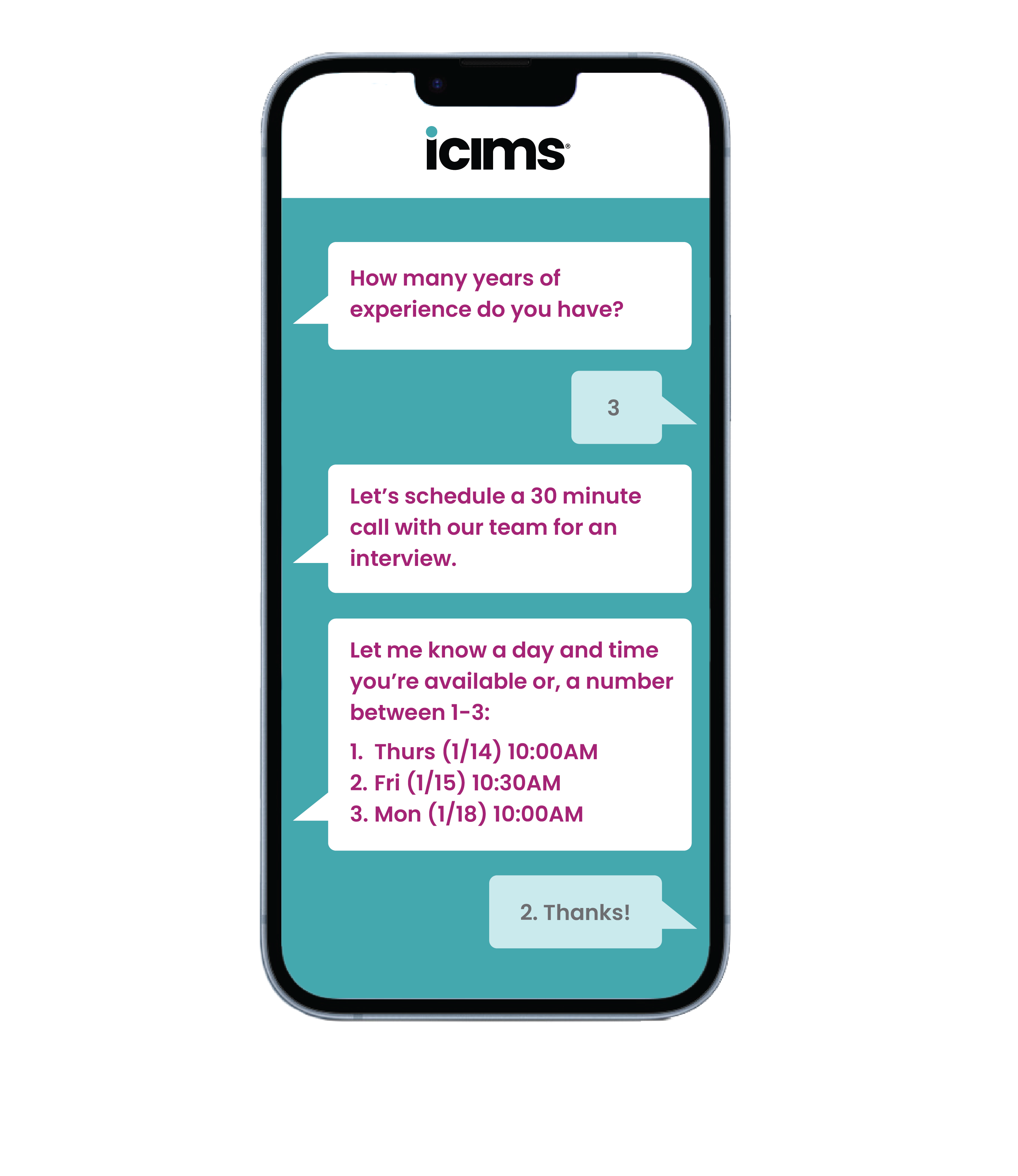 Increase efficiency and help speed up time to hire in one recruiting platform. Digital Assistant works with iCIMS Text Engagement for text-to-apply campaigns and actively populates data into your iCIMS platform. Analytics and insight help you strengthen campaigns by analyzing key candidate activities throughout the hiring process.