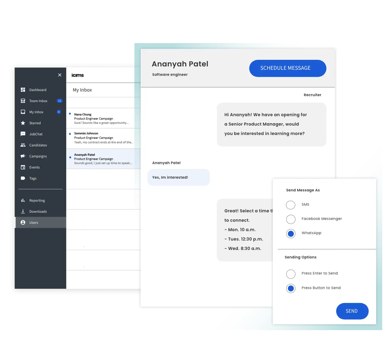 Improve recruitment efficiency by communicating with talent via the channels that resonate most, including text, chat, video and more.