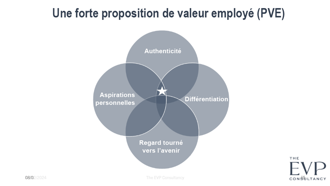 Les attentes des employés évoluent et ne se limitent désormais plus uniquement au salaire. Les réalités du terrain montrent que plus le candidat est jeune, plus il a d’attentes vis-à-vis de son employeur. Cependant, l’attractivité de votre marque employeur repose sur votre PVE, qui englobe ces 4 éléments :