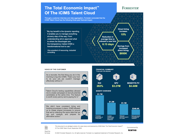 Download a snapshot of the study to learn key findings about the Total Economic Impact™ of the iCIMS Talent Cloud.